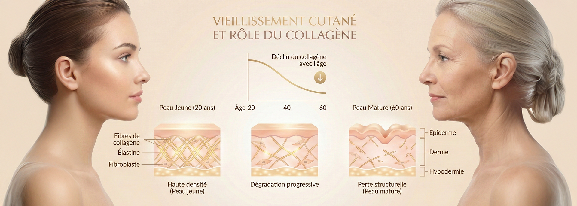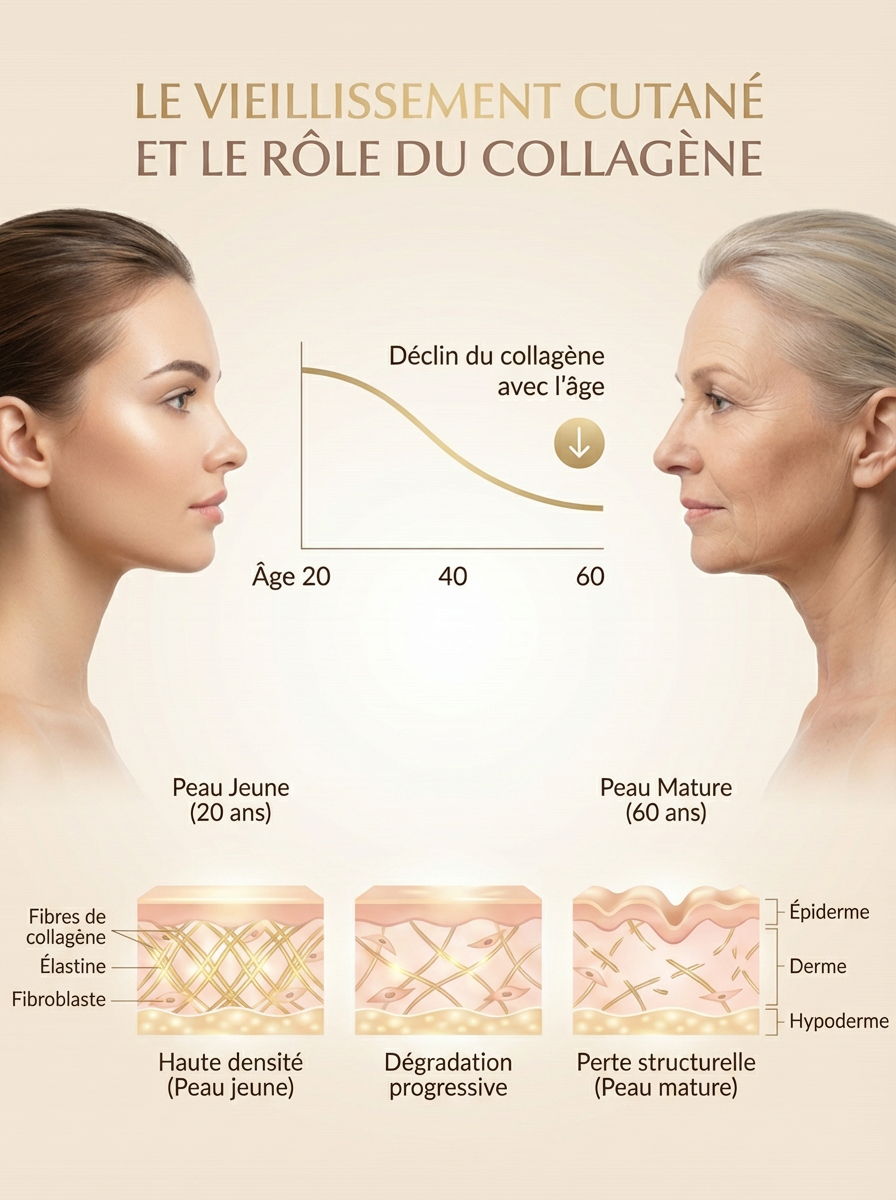 Durant la croissance et le développement, l'organisme parvient à couvrir ses propres besoins en collagène. Vers l'âge de 25 ans, la production de cette protéine diminue progressivement. À la cinquantaine, elle n'est plus que d'environ 20 %.