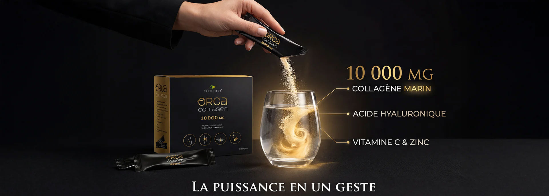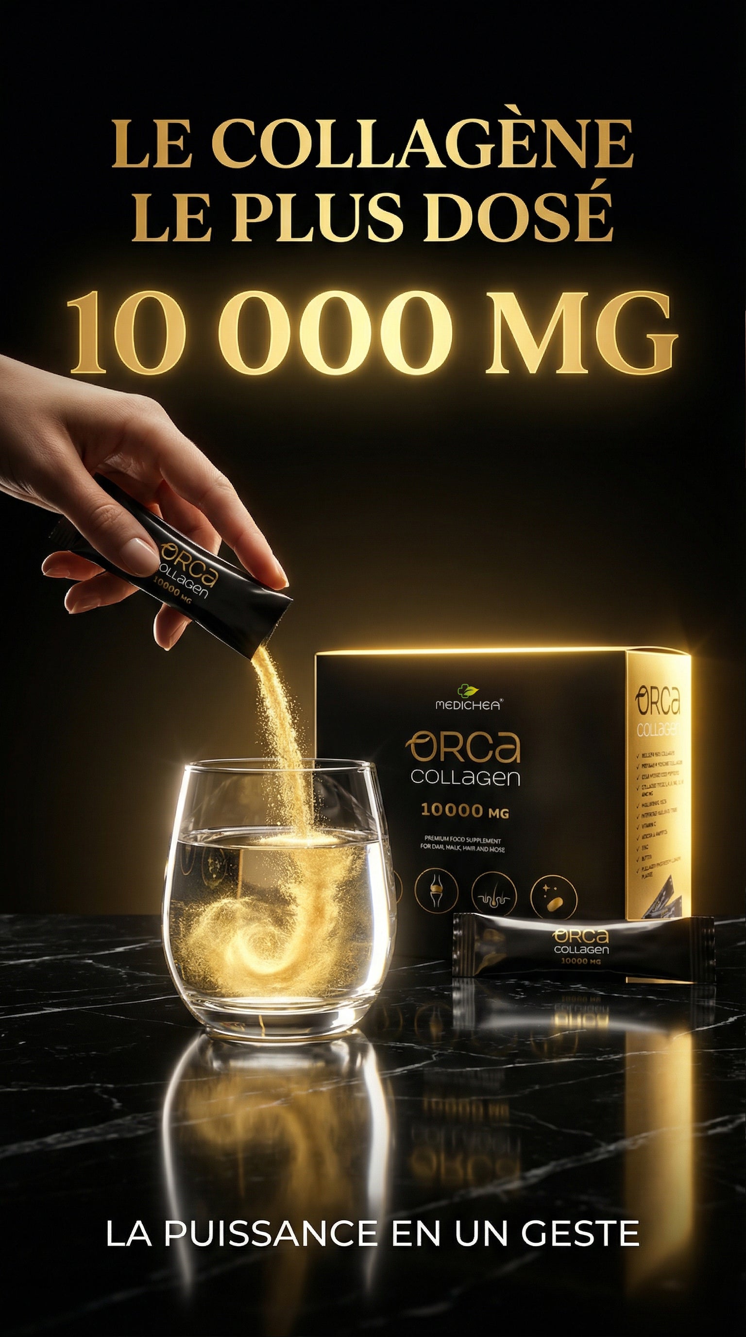 tous deux hydrolysés à froid pour une assimilation optimale et une efficacité maximale, validée par de nombreuses études cliniques. Chaque dose apporte 8 000 mg de peptides de collagène à très faible poids moléculaire (2 000 Da), garantissant une absorption rapide et ciblée par l’organisme. Orca Collagen réunit plusieurs types essentiels de collagène (I, II, V, VIII, X, XI et XIV), associés à une enzyme spécifique (GTPase) qui favorise la communication cellulaire et soutient les mécanismes naturels de régénération. La matière première marine provient exclusivement de poissons sauvages pêchés en mer du Nord, dans le respect des standards de qualité les plus exigeants. Un collagène d’exception pour révéler votre beauté, renforcer votre corps et préserver votre jeunesse.