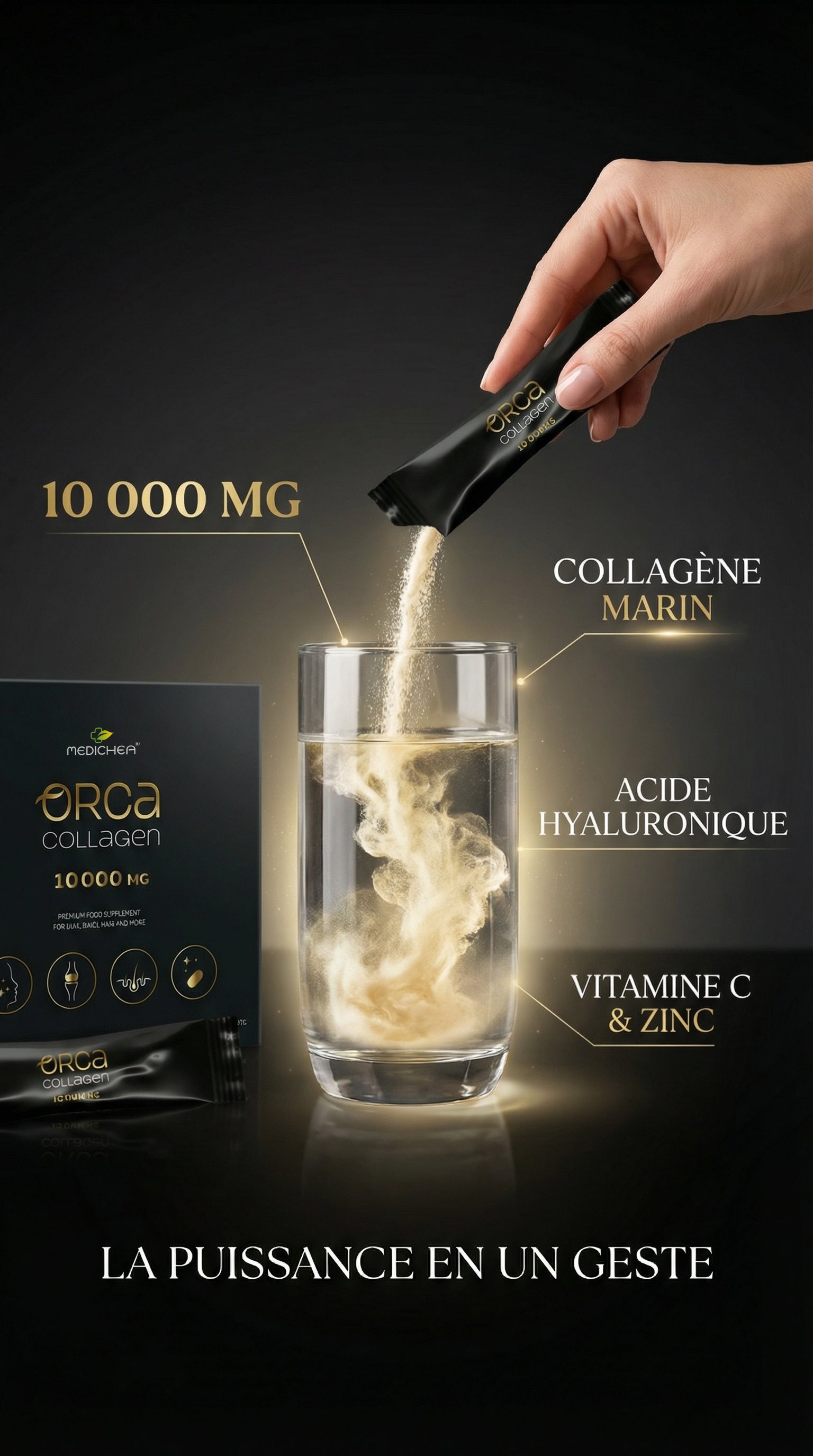 Orca Collagen est un complément alimentaire haut de gamme pensé pour agir en profondeur sur la beauté et le bien-être global : peau, cheveux, ongles, articulations et tissus conjonctifs. Sa formule exclusive associe des peptides de collagène bioactifs issus :